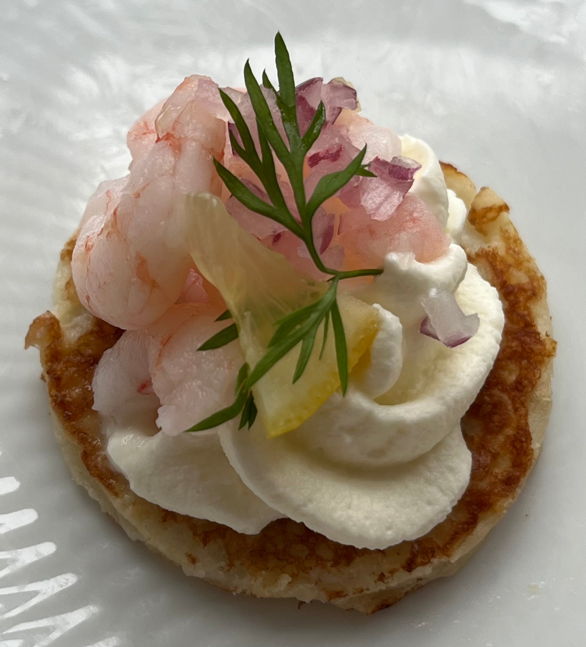 Denne elegante lille mundfuld er både en fryd for øjet og en smagsoplevelse ud over det sædvanlige. Trods den usædvanlige kombination af flødeskum, rejer og løg, er resultatet en ren fornøjelse for ganen. Disse delikate appetizers er alsidige og perfekte til enhver lejlighed.