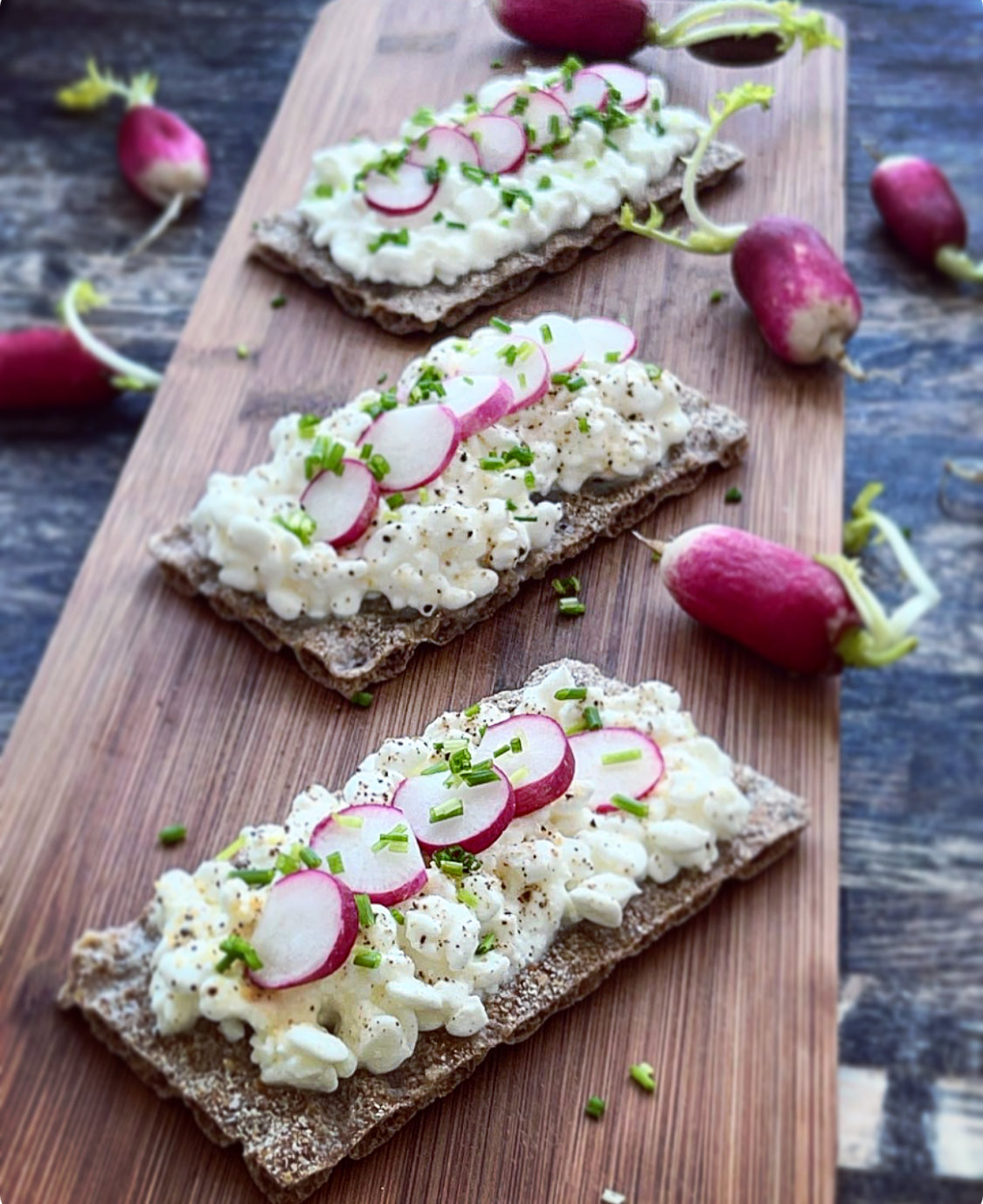 Her får du min opskrift på knækbrød med hvidløgs hytteost, friske radiser med et strejf af peber og et drys af frisk purløg. Perfekt som en hurtig snack eller let frokost, der kombinerer sprøde, cremede og krydrede smagsnuancer. Mums!