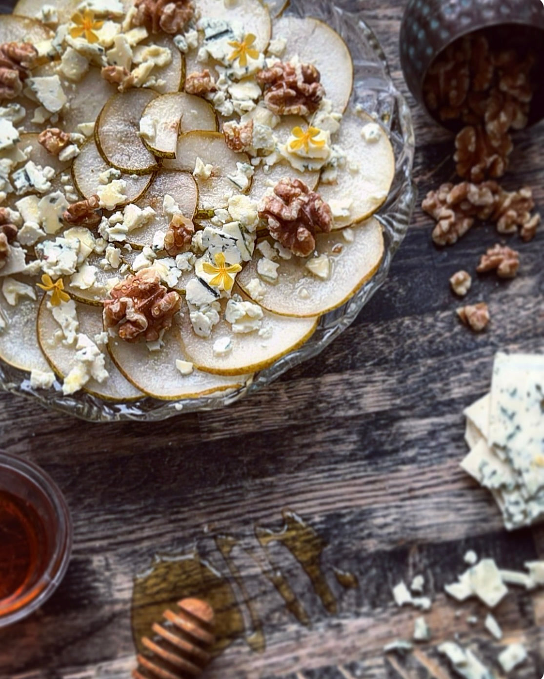 Pære sashimi er en super nem og raffineret ret, ideel som tilbehør til ostebordet eller som en mellem ret inden desserten. Den unikke sammensætning af søde pærer, knasende valnødder, ahornsirups sødme og blå skimmelostens salte nuancer giver en balanceret og udsøgt smagsoplevelse. Oplev denne delikate kombination og tilføj et eksklusivt twist til dit næste ostebord.