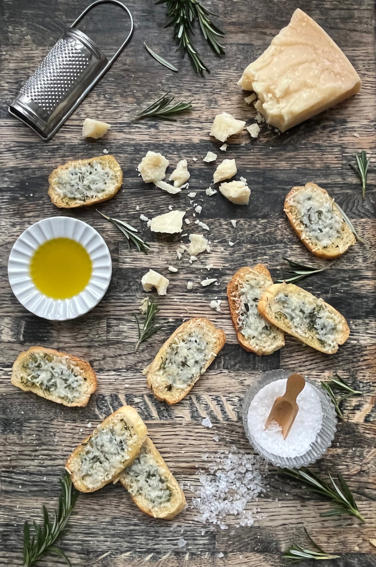 Det var her, i dette stille og inspirerende miljø, at jeg for første gang blev introduceret til disse små lækre brød, som jeg nu glæder mig til at dele med jer. De består af ristet brød, penslet med gylden olivenolie, let krydret med salt og peber, toppet med aromatisk rosmarin og afsluttet med en god mængde Parmigiano, lige nok til at give hver bid en fyldig, nøddet smag, der harmonerer perfekt med rosmarinens friskhed og brødets sprødhed.Denne simple opskrift viser, hvordan få, gode ingredienser kan skabe en uforglemmelig smagsoplevelse. Det er en hyldest til Italiens rige madtraditioner og de stille øjeblikke, hvor maden nydes med omtanke og nærvær.